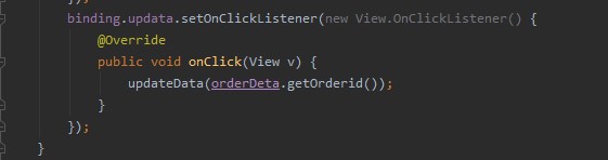 الان ارجع الى التصميم وقم بإضافة زر جديد لعمل تحديث البيانات لكي يستطيع المندوب من خلاله تحديث البيانات التي يكتبها وتعرض للمستخدم او العميل وارجع الى الكود وقم بعمل setOnClickListener واستدعاء الفانكشن بداخلة وارسال بداخلها getOrderid