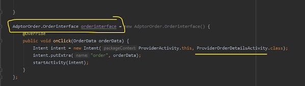 الان ارجع الى صفحة ProviderActivity وقم بتعديل الانتقال داخل orderinterface واجعله ينقل المندوب الى صفحة ProviderOrderDetailsActivity