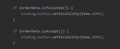 الان نريد المندوب الذي يقبل الطلب يختفي هذا الطلب من عند الباقيه ارجع لصفحة ProviderActivity وتوجة الى ميثود getorder وستجد فيها ظهور جميع الطلبات التي قام المستخدمون بطلبها بعد collection نضع whereEqualTo و accept يكون false وبالتالي لن يحضر لك اي اوردر تم قبولة من اي مندوب اخر .