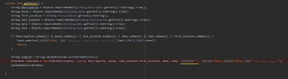 بعدها توجة الى صفحة AddOrderActivity وقم بتوجة الى getDataUi methode وبعدها في orderData قم بعمل “” وستشاهد ان providerid ظهر بعدها “” وهنا سيصل عنوان المندوب .