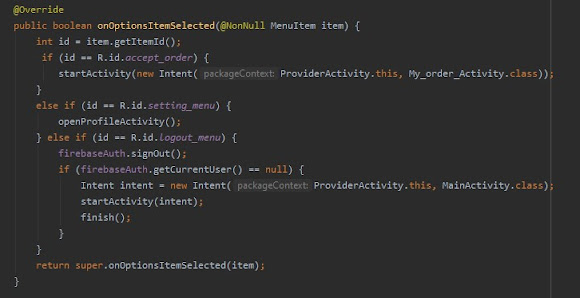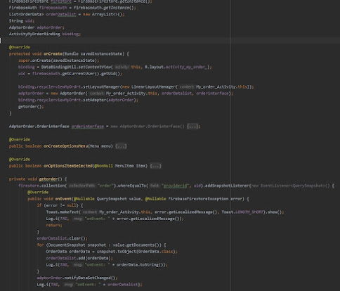الان قم بإنشاء صفحة activity جديدة بإسم My_order_Activity وقم بعمل recyclerview في صفحة xml وايضا قم بتعريفها في class وبعدها قم بعمل orderinterface و تعريف Menu menu واستدعائة وايضا قم بعمل ميثود getorder ولكن اجعل في داخلها whereEqualTo بحيث يحضر uid المندوب الذي قبل الطلب ويضعه في providerid ويظهر فقط طلبات المندوب المقبولة , يمكنك سحب الاكواد التالية من ProviderActivity هي نفس الاكواد ولكن قم بتغيير اي ProviderActivity الى My_order_Activity فقط