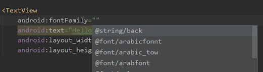 الخطوة الاخيرة ارجع الى تصميمك وابحث في android:fontFamily=”” عن نوع الخط الذي قمت بإضافتة وانقر موافق وستجد ان الخط يعمل معك على التصميم بكل سهولة