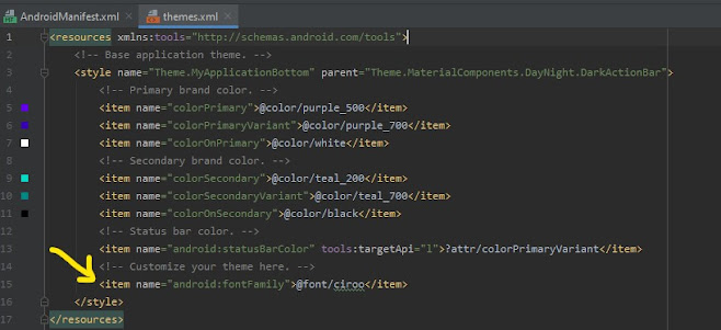 <item name=”android:fontFamily”>@font/ciroo</item>