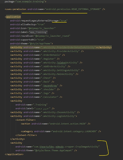 <uses-permission android:name="android.permission.WRITE_EXTERNAL_STORAGE"/>اذا كنت تستخدم اصدار جديد من برنامج ألاندرويد ستوديو ستجد انة ظهر لك على السطر الثاني من الكود لون اصفر محيط به لذلك قم بتحذفة وتوجة اسفل application واضف الكود التالي