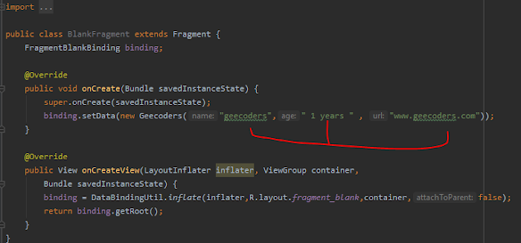 type="###" />binding.setData(new Geecoders("geecoders"," 1 years " , "www.geecoders.com"));استخدام Data binding داخل فراجمنت Fragment
