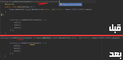 بمعنى اخر اذا قمت بعمل id لعنصر معين في xml وتريد تعريفة داخل ملف java تقوم بكتابة نوع العنصر وليكن TextView text; ومن ثم تستدعي العنصر بالاسفل عن طريق text=findviewbyid(r.id.my_text) وتفعل هذة مع جميع المتغيرات وفي الغالب تأخذ هذة المرحلة وقت كبير في الكتابة وتجعل من شكل الكود الخاص بك كبير وهذا ليس من ضمن عمليات الكود التنظيف