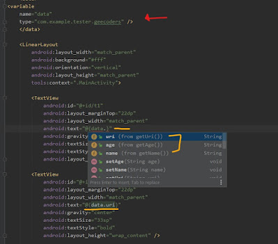 return binding.getRoot();binding.setData(new Geecoders("geecoders"," 1 years " , "www.geecoders.com"));فيديو الشرح