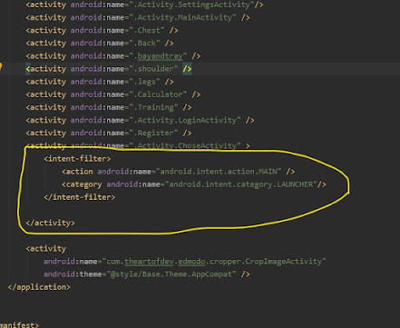 ثانينا : توجة الى ملف manifest وتأكد من اكواد activity التي تعمل في البداية وان لم تكن موجوده اضفها اسفل activity التي تعمل في الاول كما بالصورة