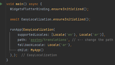 الان وقبل ال runApp قم بتعريف المكتبة وارفاق اللغات التي تعمل عليها وايضا مسار الملف الخاص بالترجمه ولغة افتراضيه ( في كلا الحالات سوف يتعرف على لغة النظام ويفتح عليها ) . ولا تنسى ايضا تفعيل المكتبة وعمل init لها .