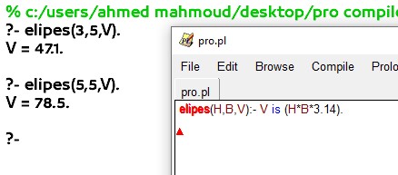 elipes(H,B,V):- V is (H*B*3.14). لمزيد من الاكواد والامثلة حول لغة prolgo يمكنك مشاهدة التالي :