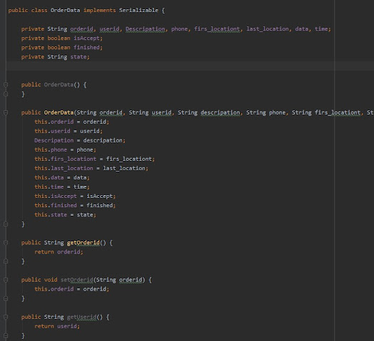 الان نريد معرفة حالة الطلب وهل تم قبول الطلب ام لا وهل انتهي المندوب من توصيلة ام لا لذلك نرجع الى OrderData ونضيف isAccept و finished بنظام boolean وحالة الطلب على شكل String وقم بعمل constructor و sitter-gitter و toString لهم