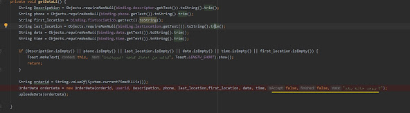 الان ارجع الى AddOrderActivity وتحديدا ميثود getDataUi وقم بإضافة البيانات داخل OrderData كما بالصورة .