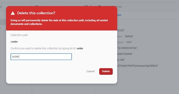 الان يفضل الرجوع الى firebase وحذف جميع الطلبات القديمة وذلك لانها لا تحتوي على حالات القبول وحالة الطلب و حالة الانتهاء يمكنك اضافتها بشكل يديو على طريق النقر على add field وكتابة الاسم وبعدها النوع وValue , يمكنك حذف document عن طريق الثلاث نقاط الموجوده اعلاه واختيار امر delete