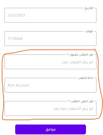 ارجع الى ملف OrderDetails وهي تفاصيل الطلب وقم بوضع TextInputEditText واحد لحالة القبول والثاني لحالة الطلب والاخير تاريخ التسليم
