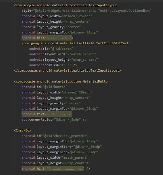 الان قم بعمل اكتفتي جديدة بإسم ProviderOrderDetailsActivity وقم بوضع نفس تصميم OrderDetails ولكن مع اختلاف بسيط وهو بدلا من TextInputEditText قبول الطلب نضعه على شكل زر وبدل TextInputEditText انتهاء الطلب نضعه على شكل CheckBox و حالة الطلب نجعل enabled لديها true لاعطاء حق التعديل للمندوب .