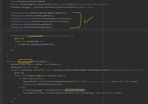 قم اولا بعمل تعريف لي OrderData لكي نستطيع جلب المعلومات منها وsetOnClickListener للزر الخاص بي قبول الطلب وقم بعمل ميثود بداخله بإسم acceptorder وارفاق getOrderid بداخل الميثود قم بعمل HashMap واجعل حالة الزر true وهذا يحدث عندما يتم النقر علية تنبية يجب كتابة بين ” ” الاسم الذي موجودد في firebase بالقبول وفي حالتي اسمة accept بعدها قم بعمل document بالاي دي الخاص باليوز لكي يشاهد التغيرات اليوزر الذي انشئ الطلب فقط بعدها قم بعمل update لتحديث المعلومات الموجوده في firebase وعمل اختبار هل نجحت العملية ام لا اذا كان الجواب نعم تظهر رسالة للمستخدم ويتم اخفاء الزر واذا لم تنجح تظهر رسالة بسبب المشكلة للمستخدم .