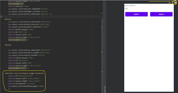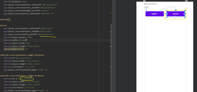 2- الان قمت بتغيير قيمة layout_constraintGuide_begin الى 0 لكي يكون في البداية وسوف تأتي الى layout_constraintStart_toEndOf لكل عنصر وسوف تجعل id الخاص بها نفس الاي دي الخاص بي Guideline لكي تتمكن من التحريك كما بالصورة .