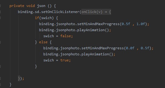 قم بإزالة app:lottie_loop و app:lottie_autoPlay من كود xml لكي لا يعمل الانميشن وبعدها توجة الى الكود وقم بتعريف الصورة , وقم بعمل boolean بإسم سويتش او اي اسم واجعلها false ولا تنسى ان تجلها جلوبال وقم بإنشاء ميثود وبداخلها حالة if للاختبار اذا كان السويتش خطأ يقوم بتشغيل الكود من البداية الى المنتصف وبعدها يعكس واذا كان الجواب صحيح يقوم بتشغيلها من النصف الى النهاية وهكذا .