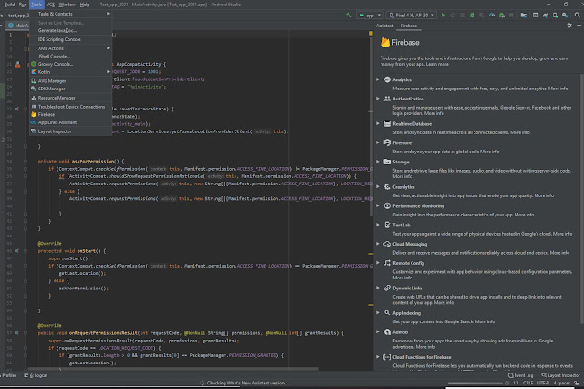 اولا يجب عليك ربط التطبيق الخاص بك بخدمة الفاير بيز وقد سبق وان شرحنا هذا من قبل في دروس تطوير تطبيقات الهواتف الذكية وكيفية ربط التطبيق بقواعد البيانات عموما بكل بساطة توجة الى tools من الاعلى واختر خدمة firebase وسوف تفتح معك القائمة كما بالصورة .
