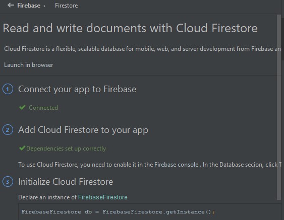 قم الان باختيار امر firestore وبعدها اربط التطبيق بخدمة فايز بيز “firebase” وبعدها فعل خيار firestore كما يظهر بالصورة , تعد خدمات فاير بيز من اهم القواعد التي يجب معرفتها في تطوير تطبيقات الموبايل لانها تربط التطبيق بقواعد بيانات على الانترنت .