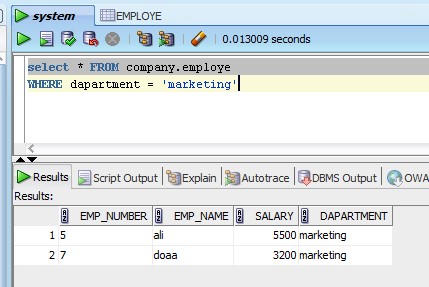 السلام عليكم ورحمة الله وبركاتة مرحبا بكم في اكواد sql حيث سوف نتعلم في هذة المقالة كيفية التي تعمل في تخصص او مجال معين او بمعنى اصح طباعة جميع المعلومات في فئة محدده من قبل المستخدم وهذا هو محور مقالة اليوم لذا تابع المقالة لكي تستفاد اولا يجب عليك إنشاء create قاعدة بيانات database تحتوي على جداول عن طريق برنامج orecal mysql وهو واحد من اقوى البرامج المستخدمة في انشاء قواعد البيانات ويجب ان تحتوي كل الجداول على بيانات باستخدام سيرفر خادم server او بدون يمكنك مشاهدة اول مقالة في Sql حيث تم شرح فيها كيف يمكنك بناء جدول داخل البرنامج ، ويوجد برامج اخرى لإنشاء مثل microsoft طريقة الكتابة syntax تختلف قليلا ولكن قريبة من بعضها لذلك تعلم استخدام اي برنامج حيث ان فرص العمل في هذا المجال جميلة جدا ويحتاج اليها الاداريون management بشكل كبير وجميع البرامج تعمل بي لغة sql ويمكنك متابعة الموقع لتجد اكواد جديدة new و شرح للكود ليس فقط في هذة اللغة ولكن يمكنك تحديد لغة معينة تريد تعملها وسوف تجدها في الموقع بإذن الله حيث يتم تعذية الموقع بشكل مستمر بالاكواد المختلفة في مختلف اللغات البرمجية