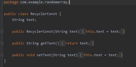 اولا قم بإنشاء كلاس جديد نضع به المتغيرات وهنا قمت بتمسيتة RecyclerConst ووضعت فيه String text لاني اريد ان اقوم بعمل عرض النصوص بشكل عشوائي اذا كنت تريد صور او غيرها فيمكنك اضافتها هنا ايضا .