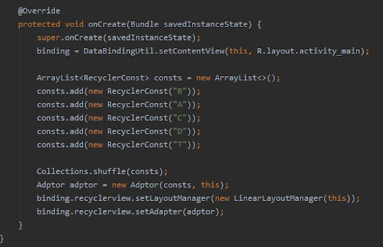 الان قم بعمل constructor و Adptor للريسيكلار فيو وبعدها ارجع الى mainactivity , قم بتعريف ArrayList الخاصه بي RecyclerConst بعدها shuffle للتبديل العشوائي فقط .