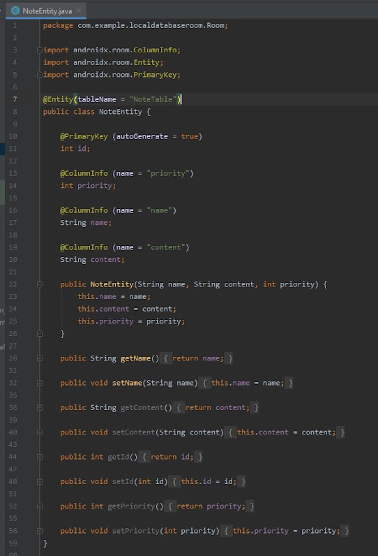 الان قم بإنشاء كلاس جديد باسم NoteEntity.class لتقوم بعمل هذا الكلاس كالجدول وقم بعمل String و int للبيانات التي تريدها وهنا استخدمت 4 متغيرات وهم id , name ,priority , content قم بعمل لهم constructor ولكن لا تقم بعمله للـ id لاننا لا نريد المستخدم ان يدخله بل نريدة قيمة تتغير وتزيد 1 عندما يتم اضافة عنصر , وبعدها قم بعمل لهم getter and setter والان قم بعمل notation اولا بالنسبة للclass قم بعمله Entity و واطلق عليه اسم وهذا الاسم سوف نستعمله عندما نريد ان نجلب البيانات وسيكون التعامل بشكل sql وقد سبق وان شرحنا لكم sql وكيف تعمل اللغه , وبعدها اطلق على جميع العناصر notation كما هو بالصورة وللتوضيح :