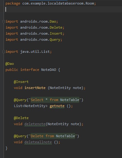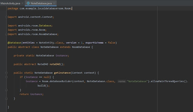 الخطوة الاولى build entity تمت و الثانية وهيا dao انتهت تبقت لنا اخر خطوة وهي Databse حيث ستكون المخصصه لعرض البيانات ولذلك قمنا بعمل private static NoteDatabase لكي نستطيع استخدامها في اي مكان و abstract NoteDAO وبعدها قمنا بعمل if بسيط يقوم باختيار اذا لم يكن هناك بيانات يقوم بتخزين البيانات واذا كانت هناك بيانات يقوم بجلبها وعرضها عن طريق عمل return للinstance وهو عبارة عن object من NoteDatabase , لو تلاحظ اننا استخدمنا allowMainThreadQueries في حفظ البيانات وهذا الامر غير محبز به والسبب هو انه عندما تكثر البيانات سوف يحدث تاخر بسيط في ui الخاص بالتطبيق ولكن في الدروس القادمة سيتم شرح javax و thread ويمكنك بعدها الاستغناء عن هذا الامر والعمل بالثيرد افضل .