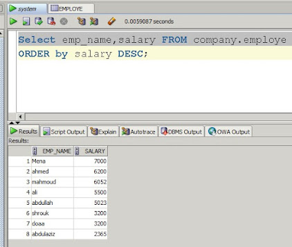 ORDER BY salary;اولا قم بتحديد العناصر المراد طباعتها وهنا قمت بتحديد الاسماء والرواتب والكود المخصص لطباعة الرواتب من الاعلى الى الاقل هو order by ومن ثم تكتب بعدها اسم العمود الذي تريد طباعة الارقام الموجودة بداخلة من الاعلى الى الاقل وبعدها اكتب امر desc .