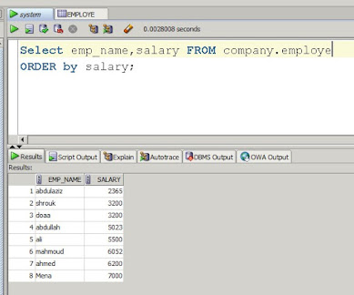 اولا قم بتحديد العناصر المراد طباعتها وهنا قمت بتحديد الاسماء والرواتب والكود المخصص لطباعة الرواتب من الاقل الى الاعلى هو order by واكتب بعدها اسم العمود المحتوي على ارقام وهنا لدي كان اسمة salary وبعدها انقر على rum ليتم طباعة الجدول كما بالصورة .