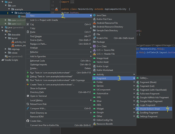 1- قم بالتوجة الى ملف ava او layout ومن ثم انقر كلك يمين – Right Click ومن ثم اختر new ومنها Fragment واختر Modle Bottom Sheet .