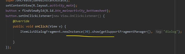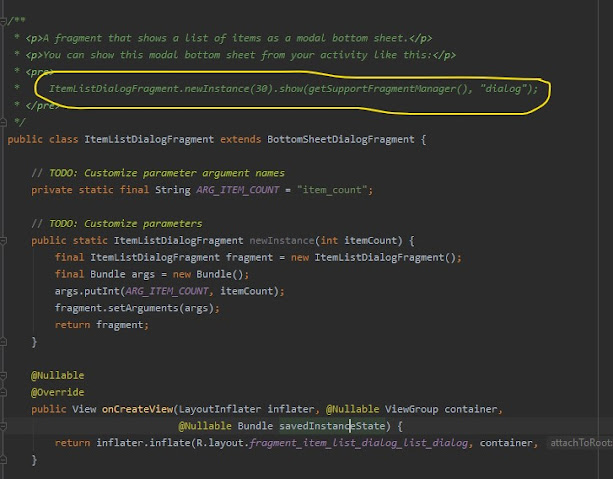 3- الان تم انشاء البوتوم شيت بسهوله سوف تجد بالاعلى كود لاستدعائه يمكنك اخذة الى MainActivity وبعدها تشغيله بها لكي يعمل البوتوم شيت هناك .
